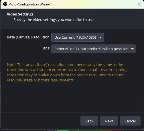 In Video, select the resolution and frame rate you'd like (common settings are 1920x1080 and 30 or 60 FPS).