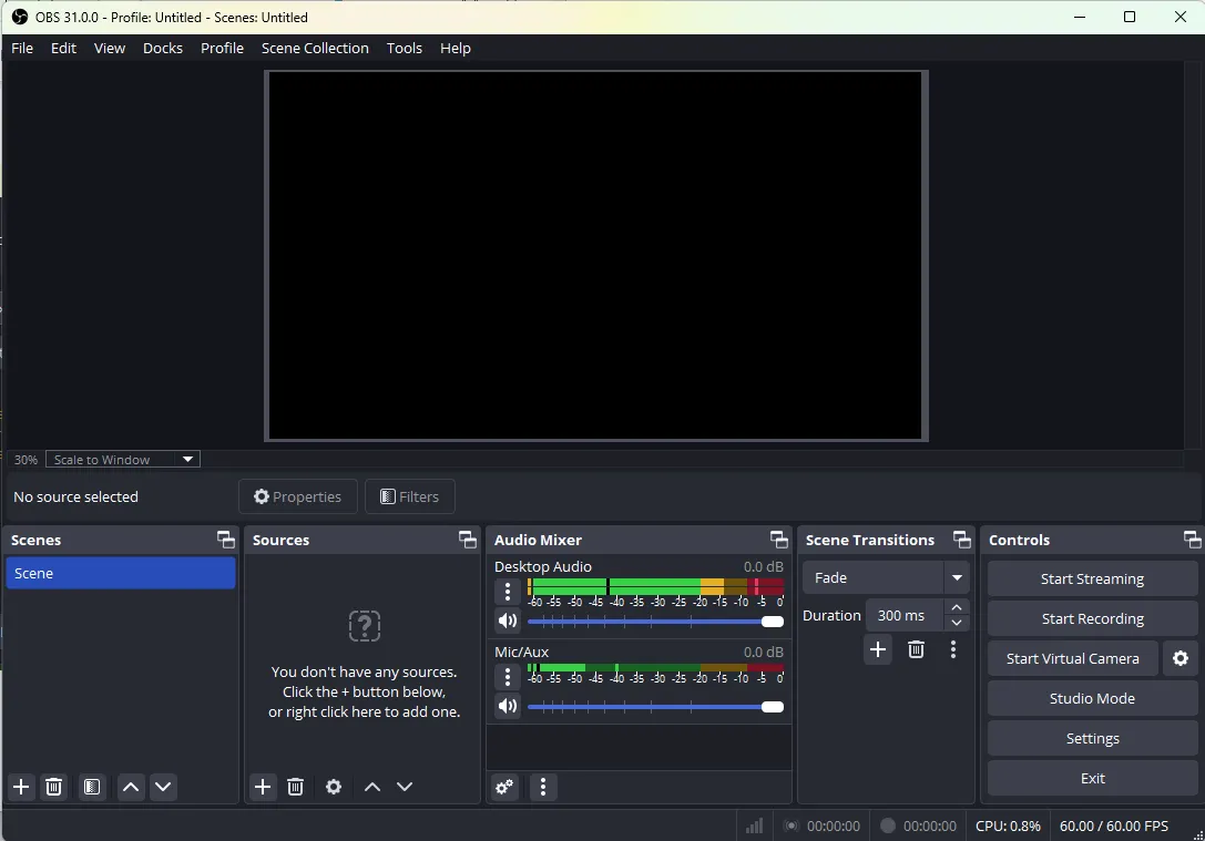 Once everything is set up, click Start Recording or Start Streaming to test the scene and sources.